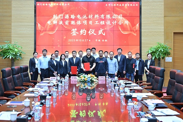10月27日,荊門源晗電池材料有限公司電解液前驅體項目工程設計合同簽約儀式在東華科技舉行。荊門源晗電池材料有限公司總經理周虎;東華科技黨委委員、副總經理葉平共同出席簽約儀式。