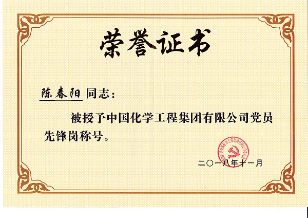 近日,公司施工管理部/安全生產(chǎn)部黨支部陳春陽同志被授予中國化學(xué)工程集團(tuán)有限公司“黨員先鋒崗”稱號。