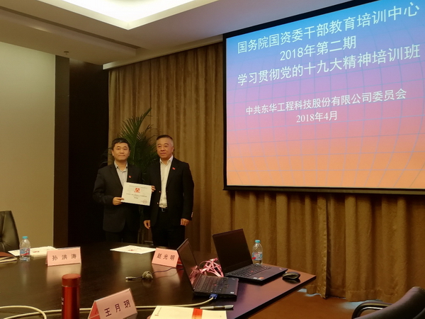 4月21日-25日,東華公司黨委組織19名專職黨務干部、1名九三學社民主黨派人士共20人,參加了國務院國資委干部教育培訓中心2018年第二期學習貫徹黨的十九大精神培訓班。該班在北京未來科學城國電研究院舉辦,共有四家中央企業360多名學員參訓。
