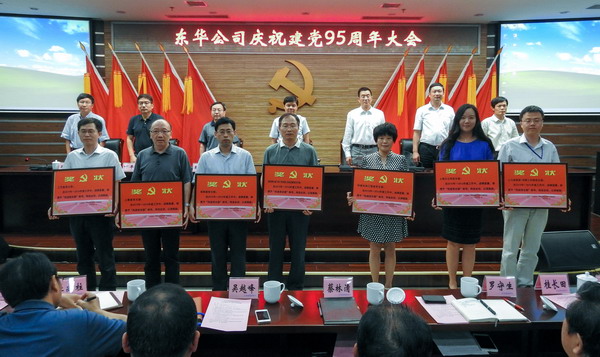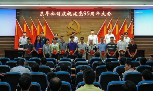 大會(huì)當(dāng)天,主席臺(tái)上布置得簡(jiǎn)樸而莊重,中國(guó)共產(chǎn)黨黨徽在兩側(cè)紅旗的簇?fù)硐赂邞抑醒?,?huì)場(chǎng)氣氛熱烈隆重。9時(shí)30分,慶祝大會(huì)在嘹亮的國(guó)歌聲中拉開(kāi)帷幕。隨后,今年新發(fā)展的黨員們?cè)邳h旗下進(jìn)行了莊嚴(yán)宣誓;黨委委員、總經(jīng)理崔從權(quán)宣讀了公司黨委《關(guān)于2015-2016年度先進(jìn)集體和優(yōu)秀個(gè)人的表彰決定》,舉行了隆重的頒獎(jiǎng)儀式,獲獎(jiǎng)的黨支部和黨員代表們先后上臺(tái)領(lǐng)獎(jiǎng)并與公司領(lǐng)導(dǎo)合影。